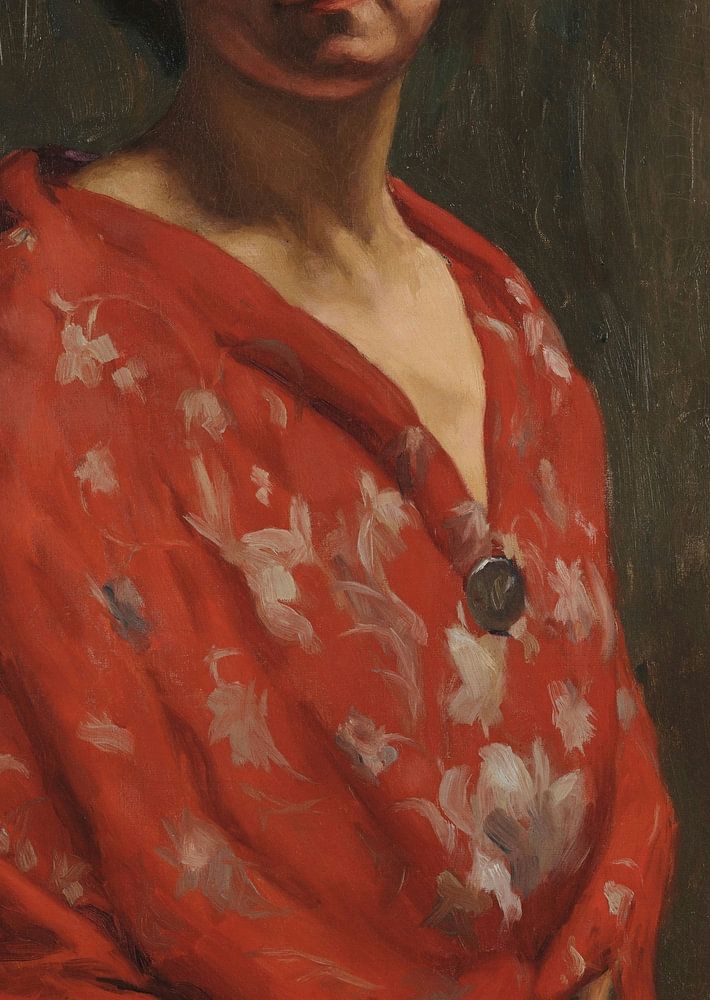 Portrait d'une femme espagnole sur fond sombre. La femme porte une robe rouge et tient un éventail.