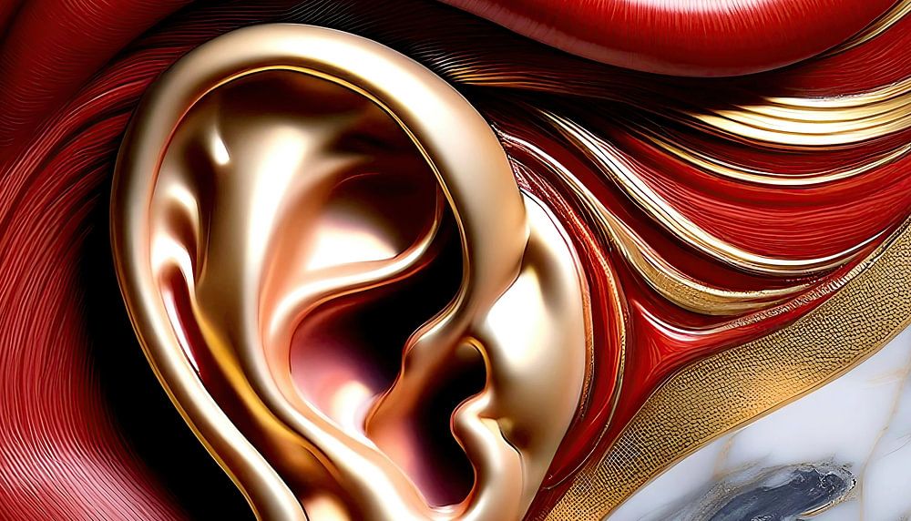 Le choix des couleurs et des matériaux renvoie au champ de tension entre physicalité et transcendance. La structure rouge évoque la vie qui palpite, tandis que l'or qui coule est une métaphore de la transformation et de la valeur. Le marbre apporte une pureté classique et une rigueur sculpturale. Ensemble, ces éléments créent un écho visuel qui va au-delà de ce qui est représenté : L'oreille comme porte sur le monde, comme instrument de perception, comme symbole de l'écoute au milieu d'une existence souvent trop bruyante.