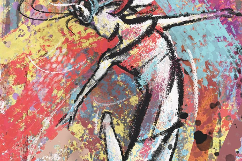 Cette femme saute de joie. Elle est entourée d'une explosion de couleurs et de textures. Cette œuvre a été créée à l'aide de techniques de dessin numérique. Le style ressemble à celui d'une œuvre d'art de rue.