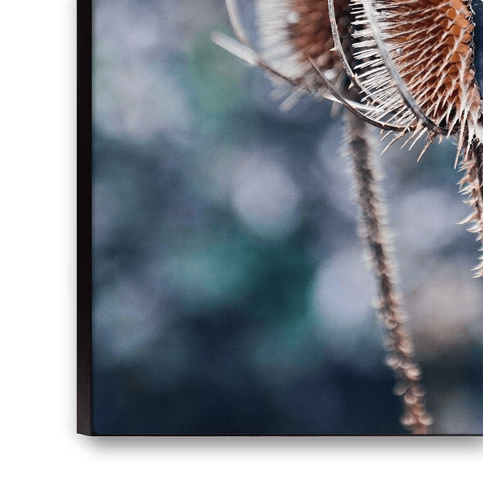 La chaude teinte brune des têtes de cardes sauvages, associée aux tons verts et bleus foncés de l'arrière-plan, crée un motif naturel automnal harmonieux. L'arrière-plan flou s'estompe et devient ainsi discret grâce à l'effet bokeh.