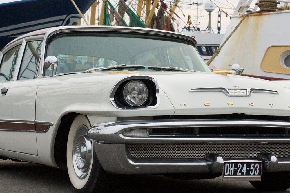 Une vieille américaine dans le port (de pêche) de Harlingen un soir d'été. C'est un DeSoto Firedome, l'année de construction est 1957. Une image avec peu de " espace vide" et beaucoup de couleurs douces.