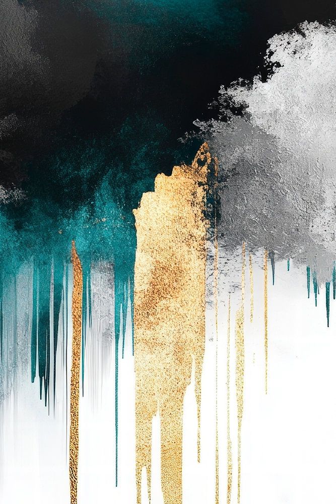 Dans des tons doux de turquoise et de gris, des motifs de nuages dramatiques s'unissent, tandis que des gouttes dorées glissent gracieusement vers le bas. Cette œuvre d'art fascinante apporte une émotion profonde et une certaine majesté à la pièce. Idéale pour le salon, elle crée une atmosphère d'élégance et de calme, parfaite pour se détendre ou s'inspirer.