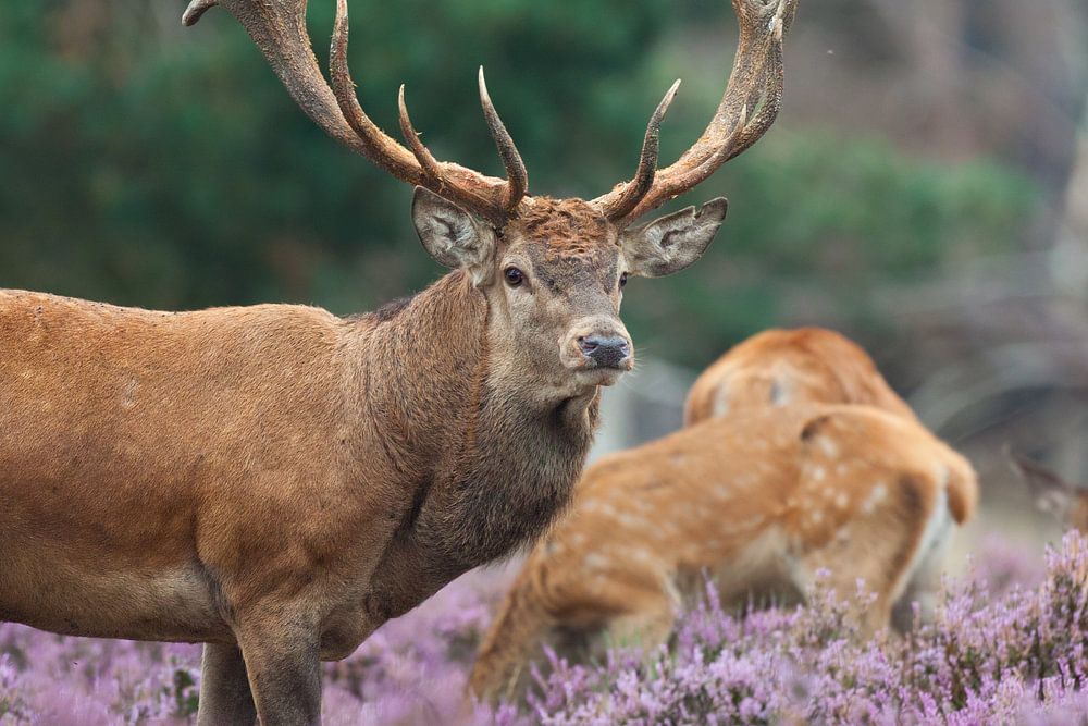 Des cerfs rouges se tiennent parmi les bruyères pourpres pendant le rut au parc de Hoge Veluwe.