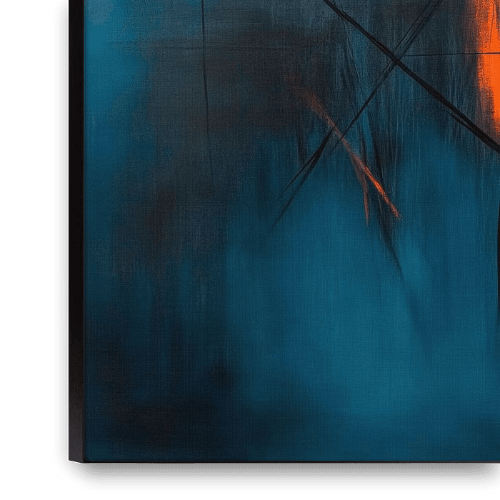 Un jeu fascinant de bleus et d'oranges profonds se déploie là où les lignes fluides et les formes géométriques s'entrechoquent. Cette composition dynamique dégage à la fois de l'énergie et de la sérénité et convient parfaitement à un salon moderne, où elle peut stimuler des conversations passionnantes et captiver les sens.