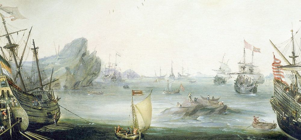 Ce tableau, qui est le plus bel exemple des premières œuvres de Van Eertvelt dans la collection du Musée maritime national, représente la diversité inhérente aux sujets traités par l'artiste. La scène animée de navires néerlandais et flamands chargés de bois se déroule dans un port naturel le long d'un fjord scandinave. Au premier plan à gauche, de nombreux troncs d'arbres ont été descendus dans la baie, où ils sont mis à l'eau par de nombreux travailleurs. Les navires à terre sont chargés par les quais arrière. Le tableau arrière du grand navire à gauche est décoré d'une image de la Vierge Marie, avec des adorateurs de chaque côté. Cela permet probablement d'identifier l'origine du navire comme étant les Pays-Bas méridionaux catholiques, bien que les trois bandes horizontales noires, or et blanches de l'enseigne n'aient pas encore été identifiées. De même, l'emblème d'un taureau ou d'un bœuf noir, queue sur le dos, sur un fond bleu, qui figure sur le taffetas supérieur : un emblème similaire d'un taureau figure sur le drapeau blanc du grand mât. Les deux peuvent représenter une ville d'origine, ou simplement le nom du navire. À droite, un navire marchand d'Amsterdam, suivi d'autres navires au loin, entre en scène. Les petits bateaux s'ébattent parmi les plus grands. Au-delà de la foule, le littoral de rochers arrondis, de pins et de pins s'élève, conduisant l'œil naa