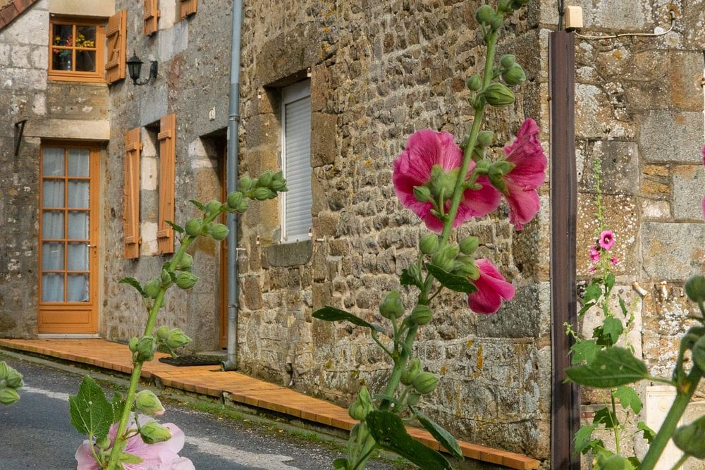 Scène de rue pittoresque avec des roses trémières dans un village de Normandie. La photo a été prise au centre du village de Rabodanges dans le département de l'Orne, commune de Putange.