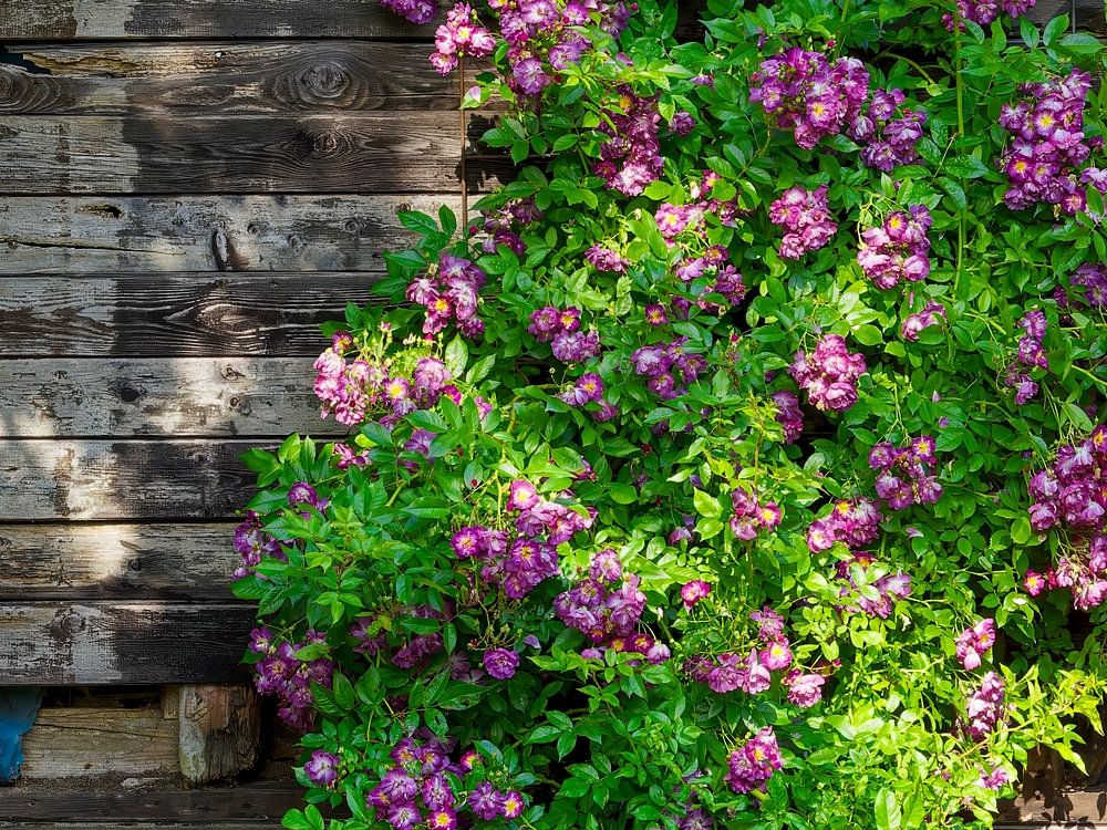 Dans un charmant spectacle où la nature reprend ses droits, des grappes de rosiers lianes d'un violet éclatant descendent en cascade le long d'un mur en bois vieillissant. Le riche feuillage vert s'entrelace avec le bois usé par les intempéries, créant un contraste enchanteur qui évoque la résilience et la beauté. La lumière du soleil se répand sur la scène, illuminant les pétales délicats et projetant des ombres douces sur les pierres en contrebas.