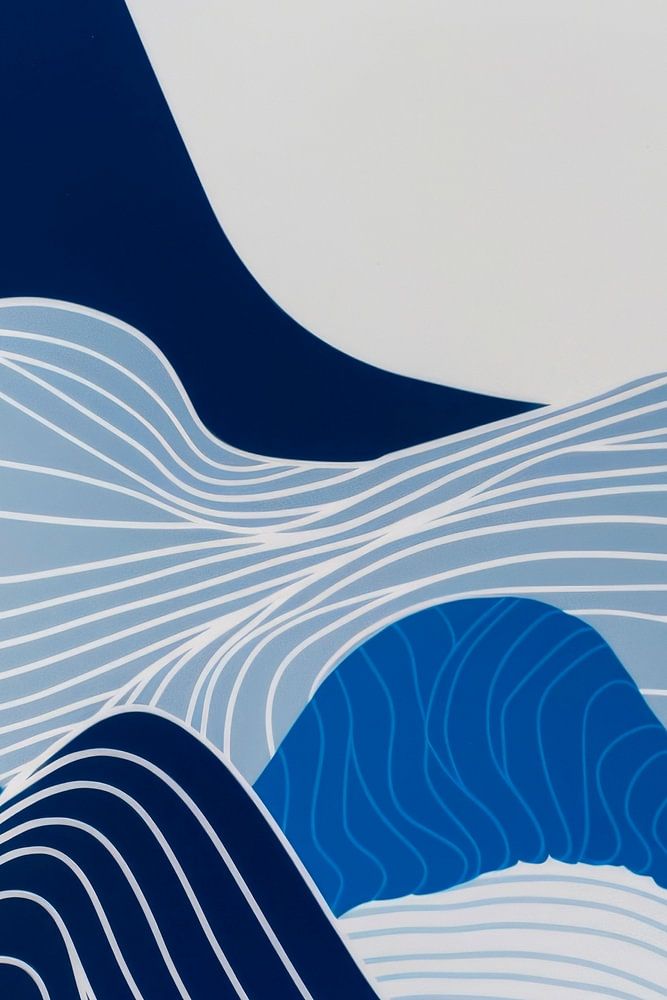 De douces vagues dans différentes nuances de bleu dansent harmonieusement sur la surface, tandis que de fines lignes soulignent le mouvement dynamique de l'eau. Le bleu foncé et le bleu clair se rencontrent, créant une atmosphère calme, presque méditative. Cette composition abstraite reflète l'élégance et la force de la nature et invite à la rêverie et à la détente.