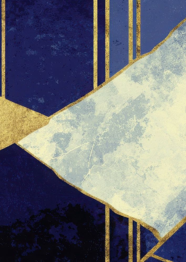 Un design art déco artistique avec des formes géométriques en bleu et or sur un fond bleu foncé. Des textures douces et des détails subtils confèrent à l'œuvre profondeur et élégance, tandis que la composition harmonieuse allie style classique et flair moderne. Les lignes précises et les accents métalliques créent un intérêt visuel et un effet luxueux. Conçu en haute résolution, le design est idéal pour les applications numériques, la décoration intérieure ou les impressions de haute qualité. L'association d'une structure géométrique, d'une palette de couleurs raffinée et de textures subtiles en fait une œuvre élégante et stylée.