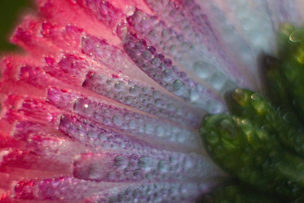 Le dessous de la marguerite a beaucoup de gouttelettes. Il s'agissait de cristaux de glace, mais ils sont rapidement devenus des gouttelettes.