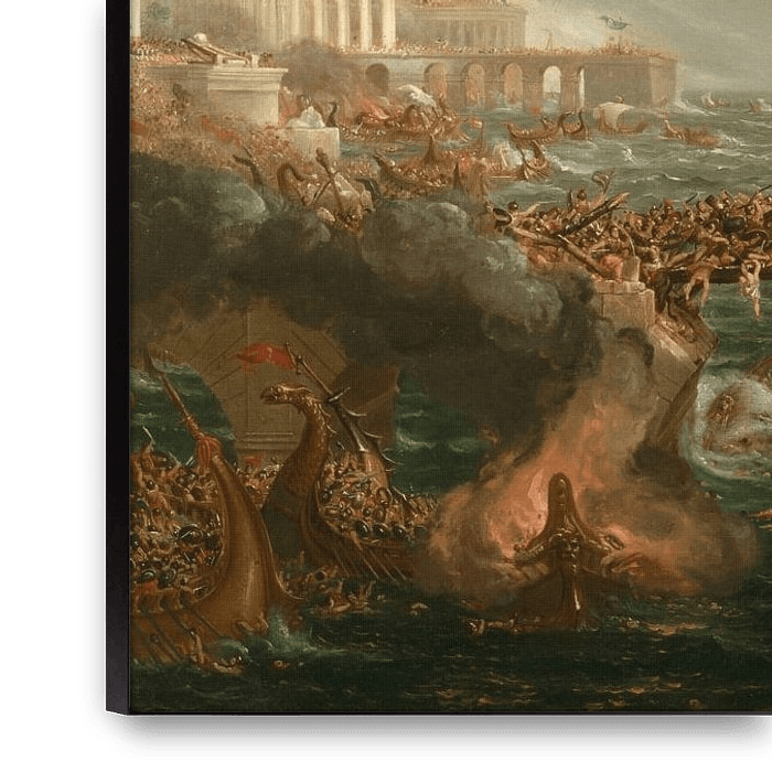 Le quatrième tableau, Destruction, a presque la même perspective que le troisième, bien que l'artiste ait pris un peu de recul pour permettre une scène plus large de l'action, et se soit déplacé presque au centre du fleuve. L'action est le sac et la destruction de la ville, au cours d'une tempête vue de loin. Il semble qu'une flotte de guerriers ennemis ait renversé les défenses de la ville, remonté la rivière et s'affaire à tirer sur la ville et à tuer et violer ses habitants. Le pont traversé par la procession triomphante est brisé, un pont de fortune qui traverse des tensions sous le poids des soldats et des réfugiés. Les colonnes sont brisées, le feu s'échappe des étages supérieurs d'un palais sur les rives de la rivière.