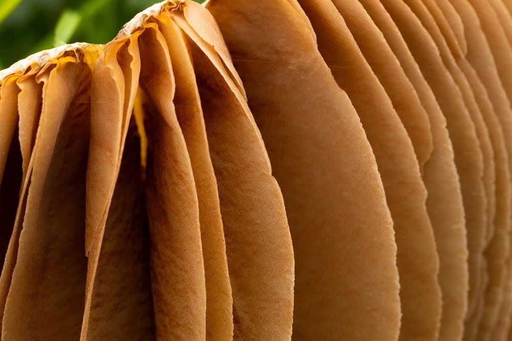 Détail des lamelles sur la face inférieure du champignon. Automne. Lamelles
