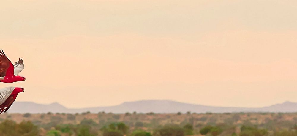Deux cacatoès roses volant côte à côte dans un paysage australien avec des battements d'ailes en miroir donnant l'impression qu'ils volent l'un au-dessus de l'autre.