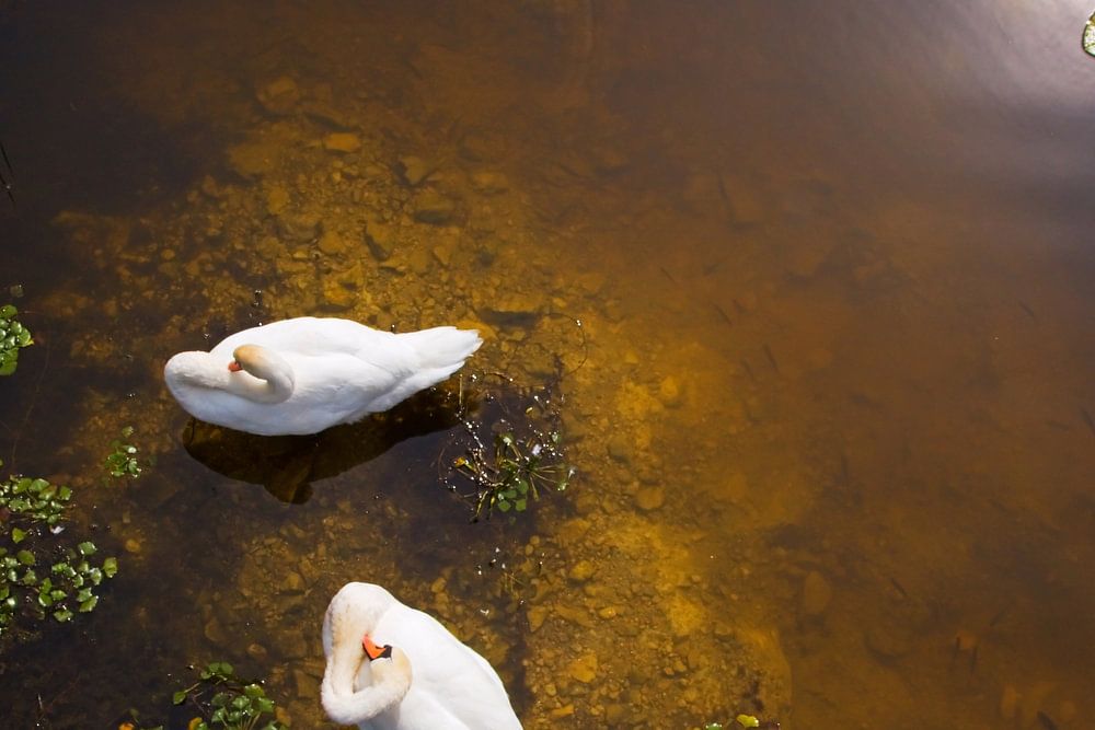 La photo montre deux cygnes glissant gracieusement dans des eaux peu profondes. Les rayons du soleil éclairent l'eau, créant un reflet brillant qui danse à la surface. La lumière éclaire les oiseaux, mettant en valeur leurs superbes plumes blanches et leur long cou. Les cygnes semblent être en parfaite harmonie les uns avec les autres, se déplaçant dans l'eau avec aisance et beauté. L'eau peu profonde crée un contraste étonnant avec le soleil brillant, projetant des ombres délicates sur les cygnes et la végétation environnante. L'eau est claire comme du cristal, ce qui permet de voir parfaitement les pieds des cygnes qui pagaient gracieusement dans l'eau. Le défi de trouver un point élevé pour prendre une photo vers le bas ajoute une couche supplémentaire d'intrigue à la photo. L'angle donne une perspective unique sur les cygnes et le magnifique reflet, mettant en valeur leur beauté et leur majesté. L'attention portée aux détails et les efforts déployés pour prendre cette photo ont permis d'obtenir une image à couper le souffle qui met en valeur la beauté et la grâce de ces magnifiques oiseaux. Deux cygnes avec le reflet du soleil sur une eau peu profonde. Deux cygnes blancs se tenant dans une eau peu profonde avec le soleil qui brille sur les oiseaux et les animaux.