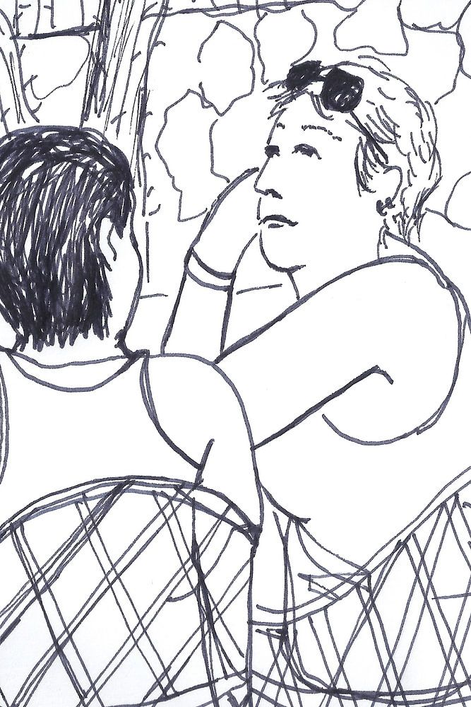 Deux femmes discutent à une table blanche, attendant leur repas sur une terrasse avec vue sur la mer. Je peux entendre qu'ils parlent allemand, mais je n'écoute pas. Les cactus et le mur de pierre forment une belle toile de fond à leur conversation, tandis que les chaises en osier grincent de temps en temps, comme le font les chaises en osier.