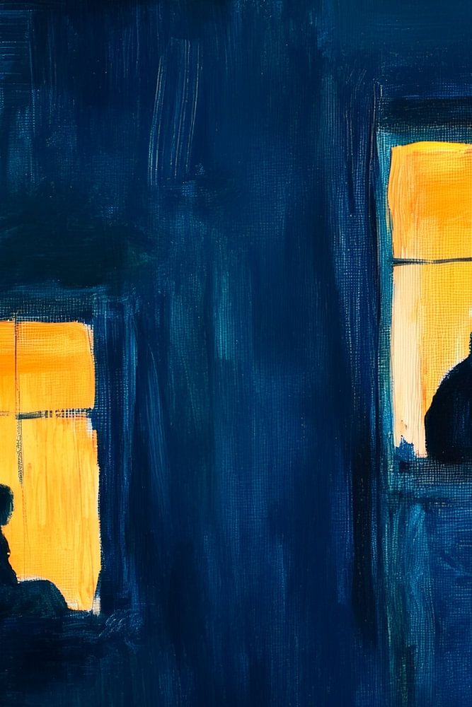 Sur un fond bleu profond, des lumières chaudes et dorées émanent de deux fenêtres qui racontent des histoires de vie et de solitude. Des silhouettes s'attardent dans la douce lumière, tandis que la nuit garde ses secrets. Cette œuvre d'art évocatrice s'harmonise parfaitement dans le salon, où elle stimule les conversations et crée une atmosphère mélancolique.