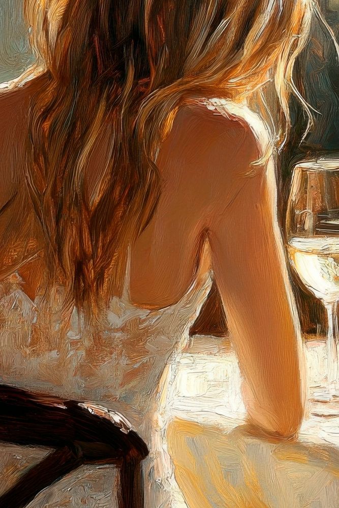 Dans des tons de terre doux, la scène ressemble à un moment de réflexion tranquille. Un dos délicat vêtu d'une élégante robe en dentelle en constitue le centre, tandis que deux verres au contenu chatoyant sont prêts à être servis. La lumière s'écoule doucement à travers la fenêtre et enveloppe la grâce de Stillife, qui respire à la fois la tension intime et l'anticipation.