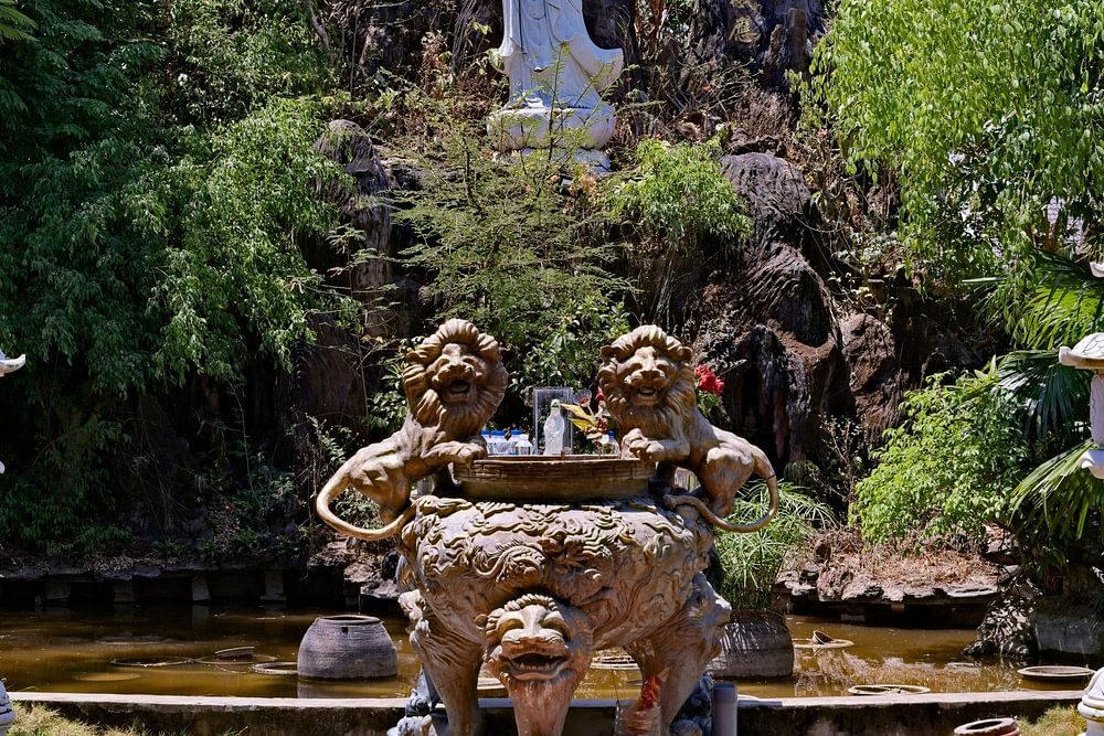 Dans ce paisible jardin sacré à Hội An, une majestueuse statue de bodhisattva s’élève, protectrice, au sommet d’un amas rocheux recouvert de verdure tropicale. Sculptée dans la pierre blanche, elle semble veiller silencieusement sur un bassin ancien aux eaux stagnantes, bordé de jarres et de socles circulaires flottants.