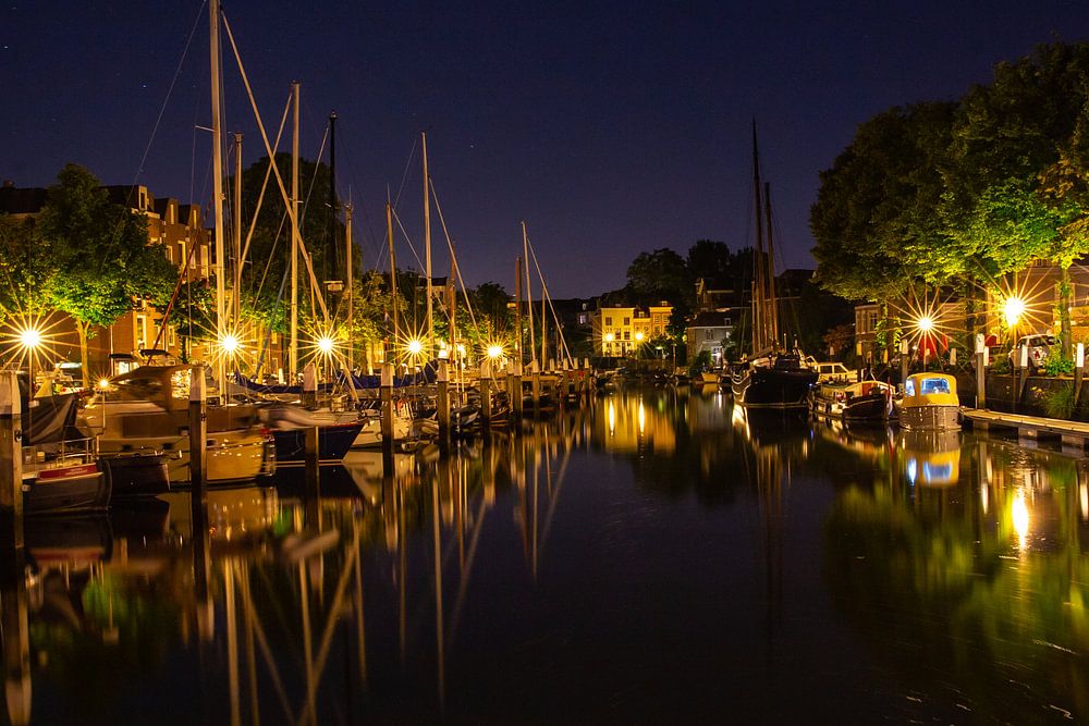 Ici, vous pouvez voir le Wijnhaven à Dordrecht, magnifiquement éclairé le soir.