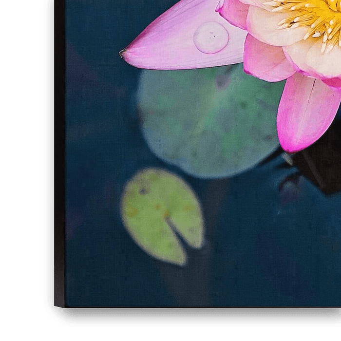 Deux belles fleurs de nénuphar en forme d'étoile rose vif avec un coeur jaune sur fond bleu-vert foncé.