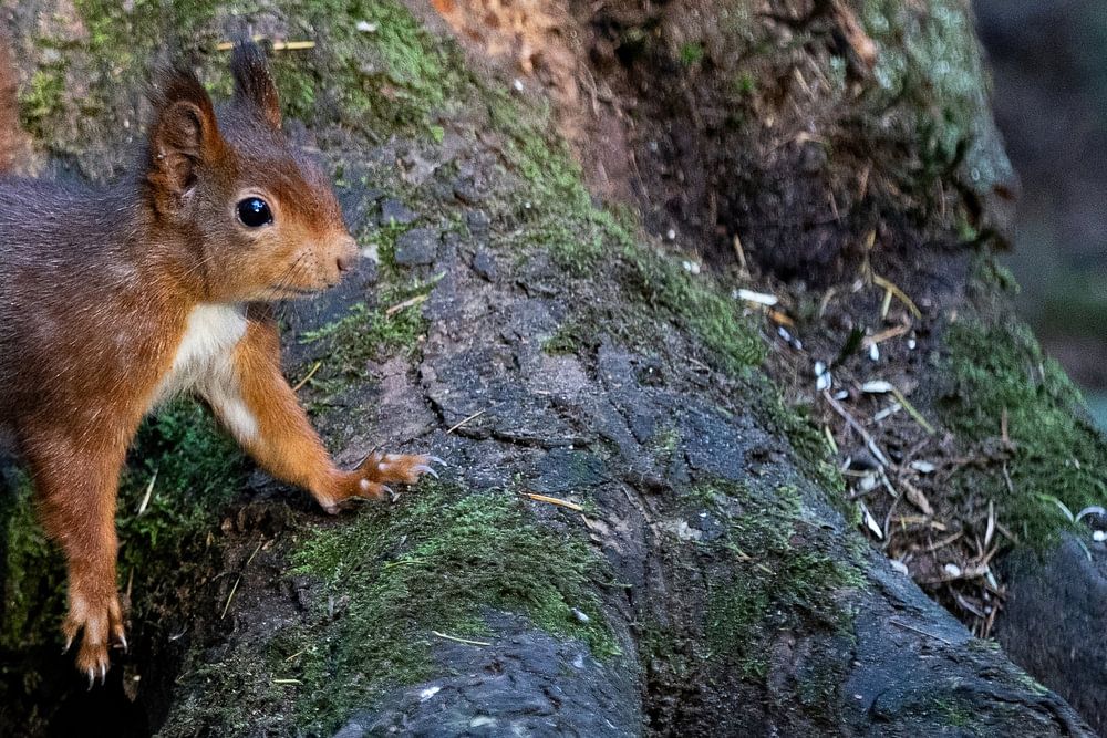 Cet écureuil est assis au pied de l'arbre à la recherche d'une noix.