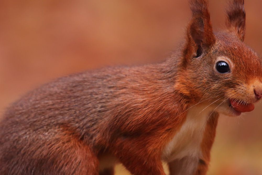 Gros plan d'un écureuil avec une cacahuète dans un décor d'automne.