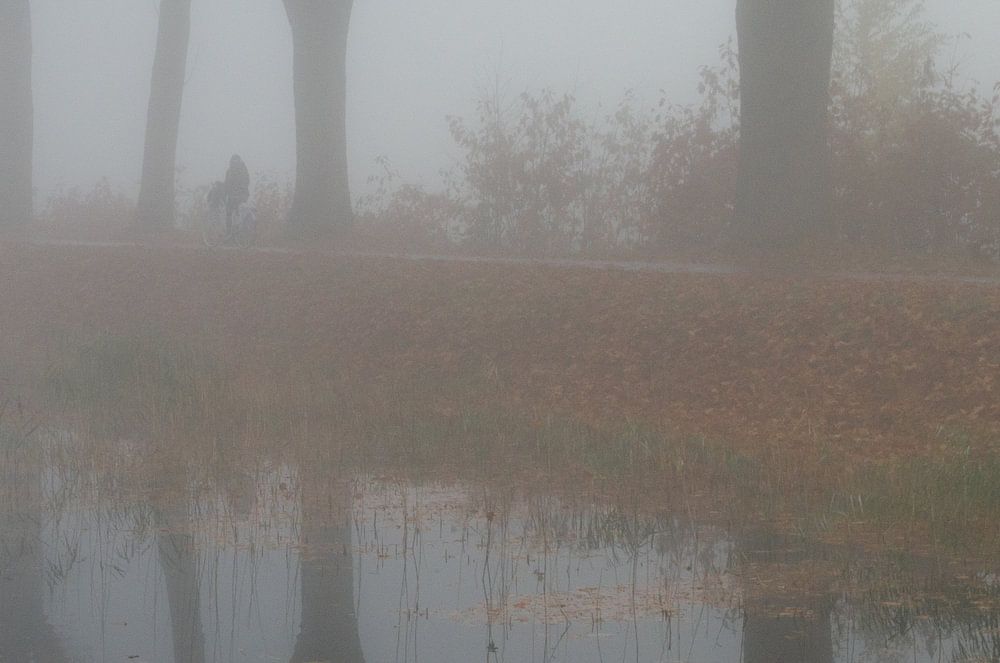 Een echt hollandse mistige ochtend. Windstil, fietser langs het kanaal, mooie herfstkleuren.