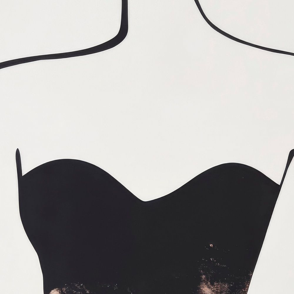 Une silhouette stylisée et féminine flotte dans une grâce élégante. Les lignes souples soulignent les courbes et l'élégance sobre du corps. Le contraste entre le noir et le blanc transmet un raffinement intemporel, tandis que l'ourlet mat de la jupe gagne en profondeur grâce à des textures subtiles. Un chef-d'œuvre minimaliste qui capture la beauté et le style dans un équilibre harmonieux.