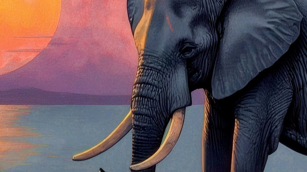 Cette œuvre d'art numérique de style peinture capture la force tranquille de la nature dans une scène de coucher de soleil à couper le souffle avec un seul éléphant. L'éléphant se tient gracieusement sur une plaine herbeuse près d'un cours d'eau calme et est représenté avec des détails réalistes - sa peau texturée, sa trompe recourbée vers le haut et ses défenses d'ivoire distinctives dégagent une force et une dignité tranquilles. La composition est plongée dans des tons chauds d'orange, de rose et de violet, tandis que le soleil couchant domine l'horizon et projette un reflet doré sur l'eau qui s'agite. Le ciel se transforme, passant du pourpre profond au rose doux, créant une atmosphère à la fois dramatique et paisible qui inspire le respect et la réflexion.