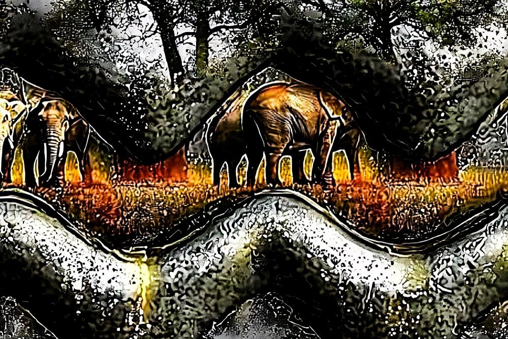 Apportez une touche d'art unique et accrocheur à votre intérieur avec ce design impressionnant. Il combine des éléments réalistes tels que des éléphants et des arbres avec une touche surréaliste, ce qui en fait un véritable accroche-regard dans n'importe quelle pièce. L'association ludique de couleurs, de textures et de motifs abstraits rend cette œuvre d'art parfaite pour les amateurs de styles contemporains et éclectiques. Le design est idéal pour ajouter une atmosphère audacieuse et créative à votre salon, votre couloir ou votre bureau. Donnez à votre intérieur une touche artistique avec cette décoration murale unique.