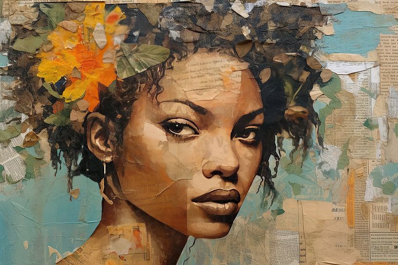 Portrait d'Eliana - peinture abstraite / mixed media art peint. Joli contraste entre un portrait sophistiqué et une technique de collage/peinture brute.