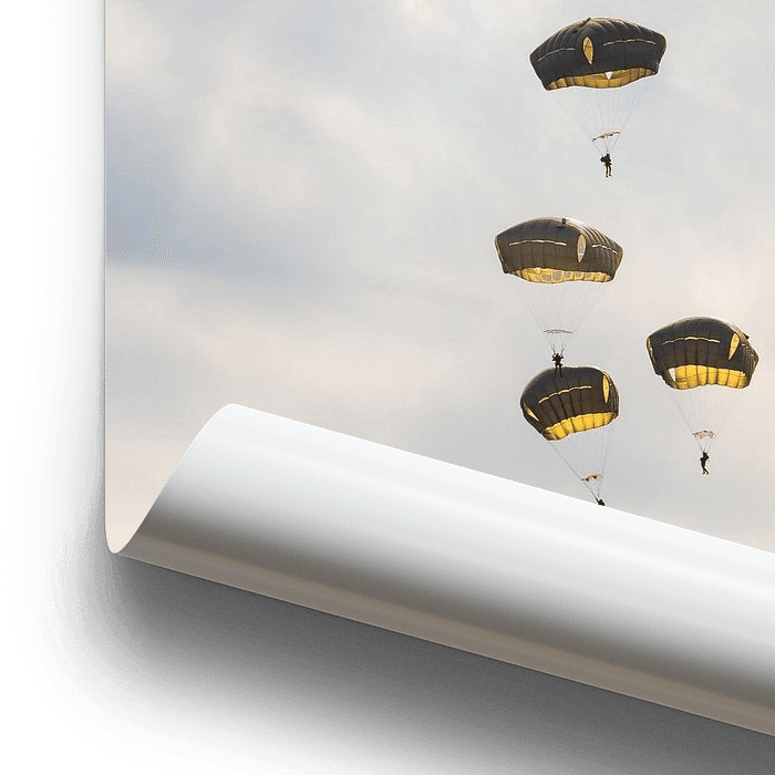 Cette photo capture un moment spécial où des parachutistes flottent doucement sur un fond de ciel nuageux typiquement hollandais. Ces parachutistes, aux teintes ensoleillées, flottent au-dessus de la Ginkelse Heide à Ede, et font partie d'une commémoration annuelle qui honore les sauts courageux des soldats lors de l'opération Market…