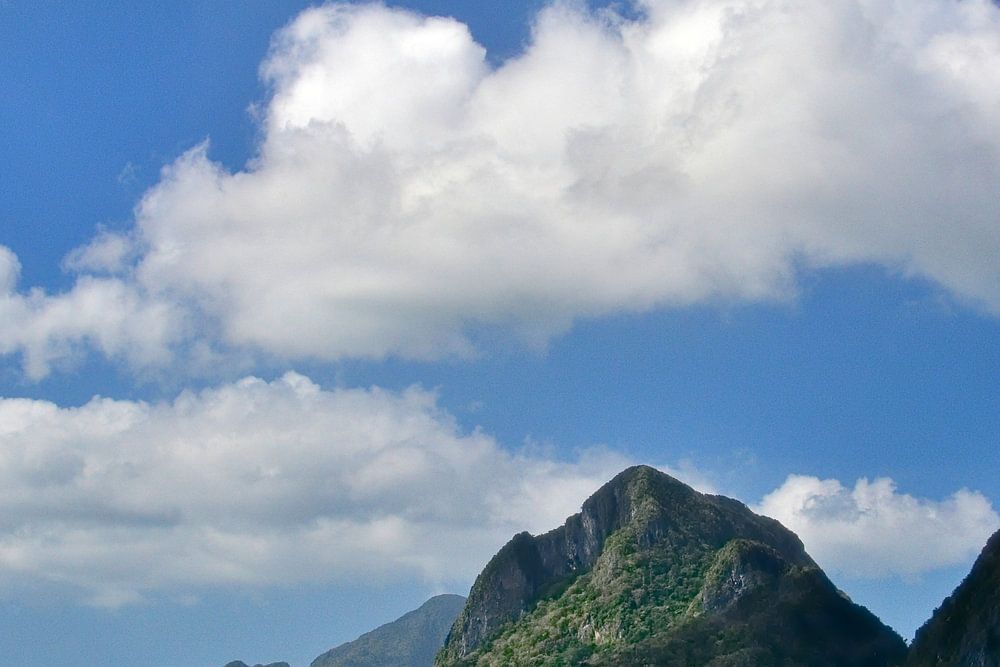 Sur les eaux calmes d'El Nido, un bateau traditionnel navigue au rythme des vagues. Les collines d'une île en arrière-plan se dévoilent dans une palette de verts, rendant hommage à la beauté naturelle de ce coin des Philippines.