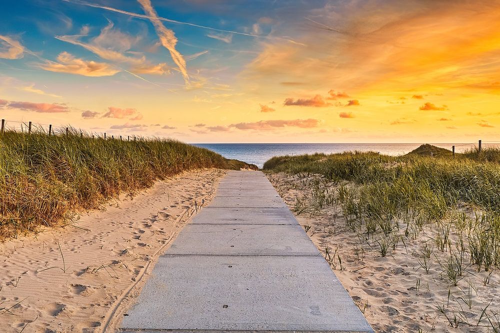 Plage ou entrée de plage Falga à Julianadorp pendant un coucher de soleil en été. Paysage de dunes le Noordduinen entre Den Helder et Julianadorp