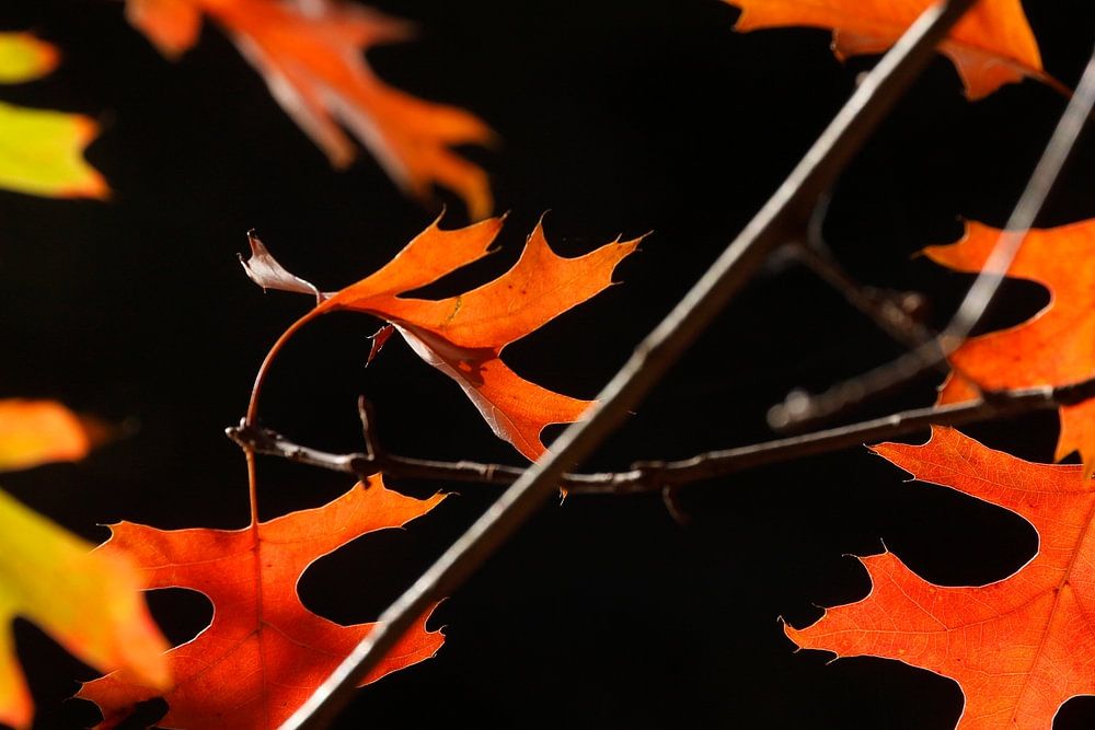 Érable (Acer palmatum), feuilles d'automne rouges sur un arbre, fond sombre, Allemagne