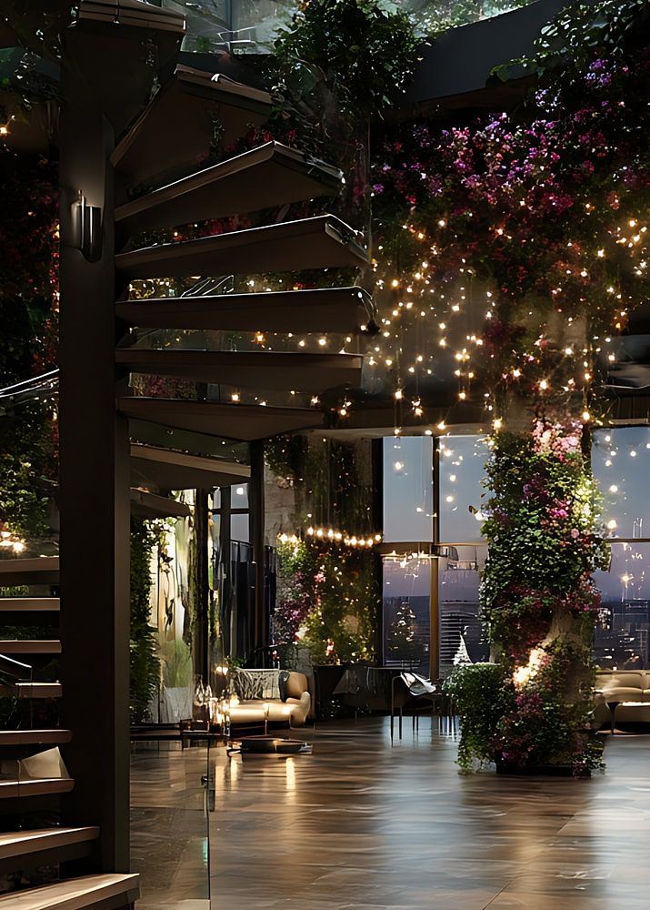 Cette image montre un élégant escalier en colimaçon qui s'intègre harmonieusement dans un environnement luxueux, littéralement embrassé par les plantes et les fleurs. Les murs et les colonnes sont abondamment recouverts d'éléments floraux, des guirlandes lumineuses sont suspendues entre les lianes et les fleurs, créant une atmosphère chaleureuse et féerique. Les grandes fenêtres laissent passer la douce lumière du soir d'un paysage urbain moderne. Le décor semble presque surréaliste - comme un palais botanique au cœur d'une métropole.