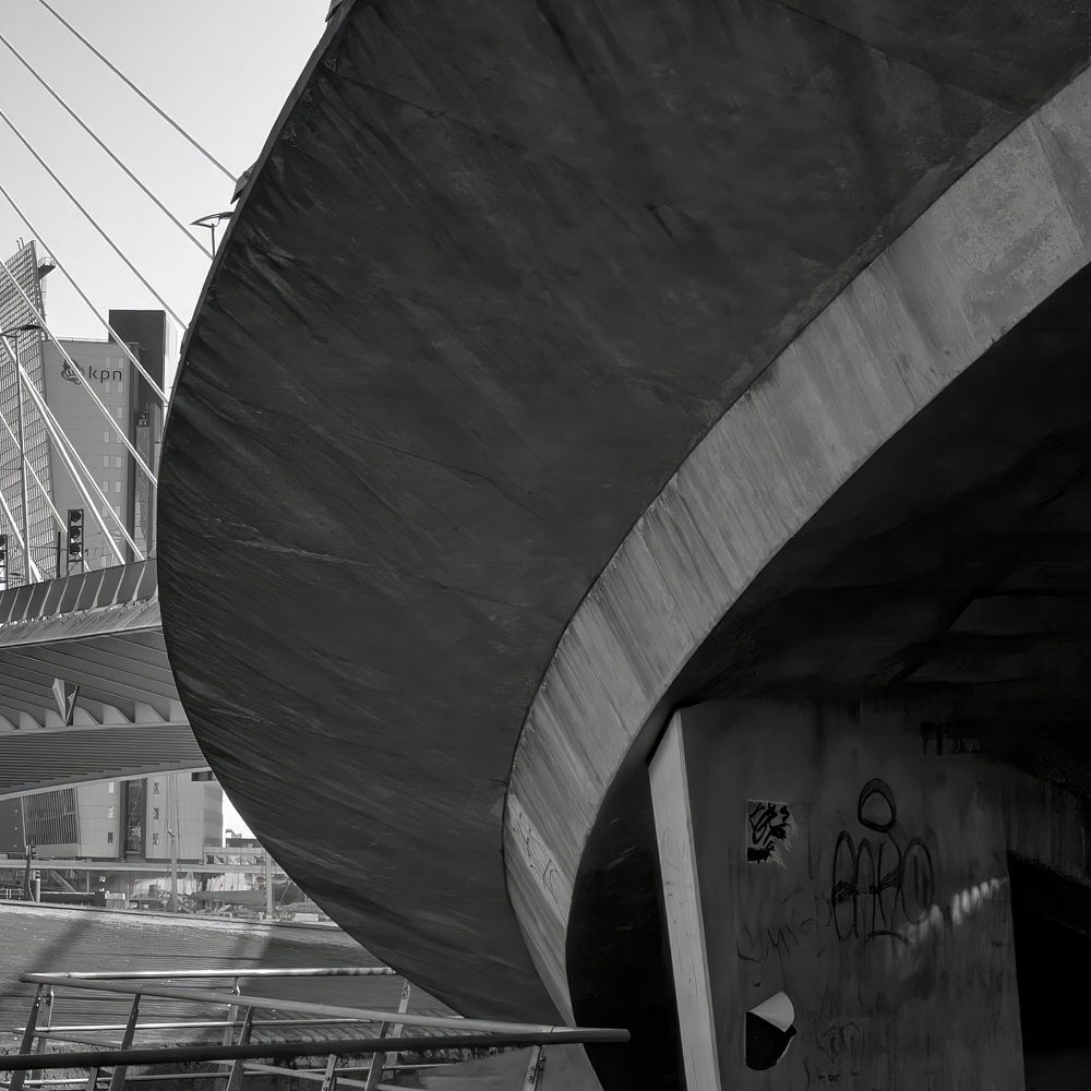 Une photo contrastée en noir et blanc de l'entrée du pont Erasmus à Rotterdam. La photo a été prise avec une vue basse du côté de Rotterdam Centrum/ Willemsplein à côté du pont Erasmus. L'aspect industriel en béton met en valeur l'énorme digue sur la rivière Nieuwe Maas qui se termine au Kop van Zuid. Où le bâtiment de KPN est visible.