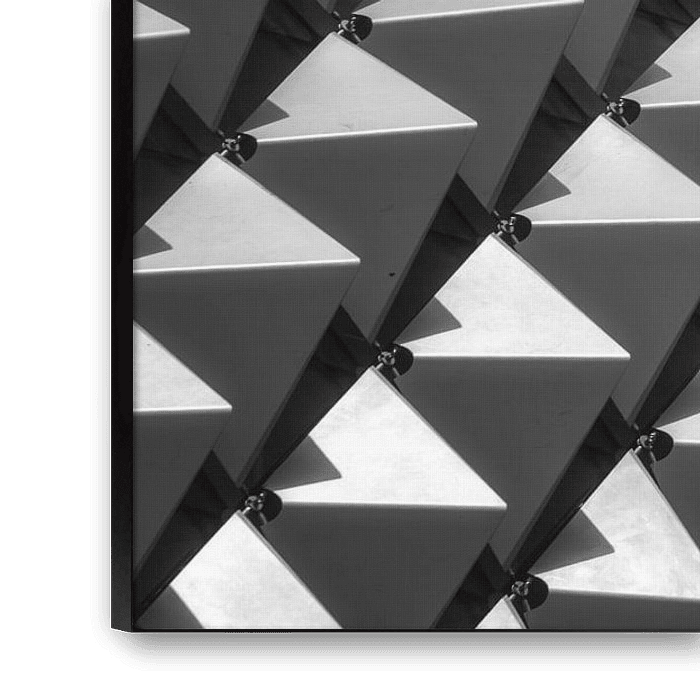 Ce qui m'a immédiatement fasciné, c'est le rythme des panneaux triangulaires et le jeu d'ombre et de lumière créé par le soleil qui glisse sur la surface. La répétition de la structure et la puissance graphique du dessin en font un sujet visuellement intriguant. J'ai délibérément choisi une composition où les lignes portent le regard à travers l'image et où l'abstraction est presque hypnotique.