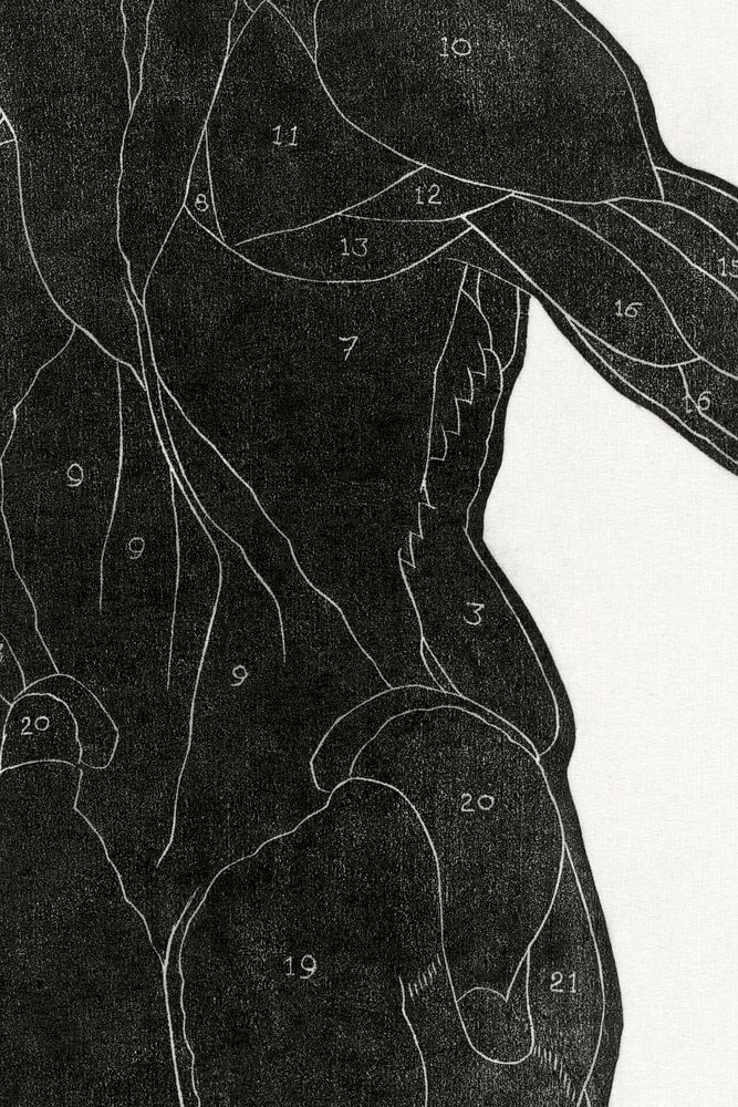 Voici le dessin du dos d'un homme, montrant les muscles qui sont numérotés.