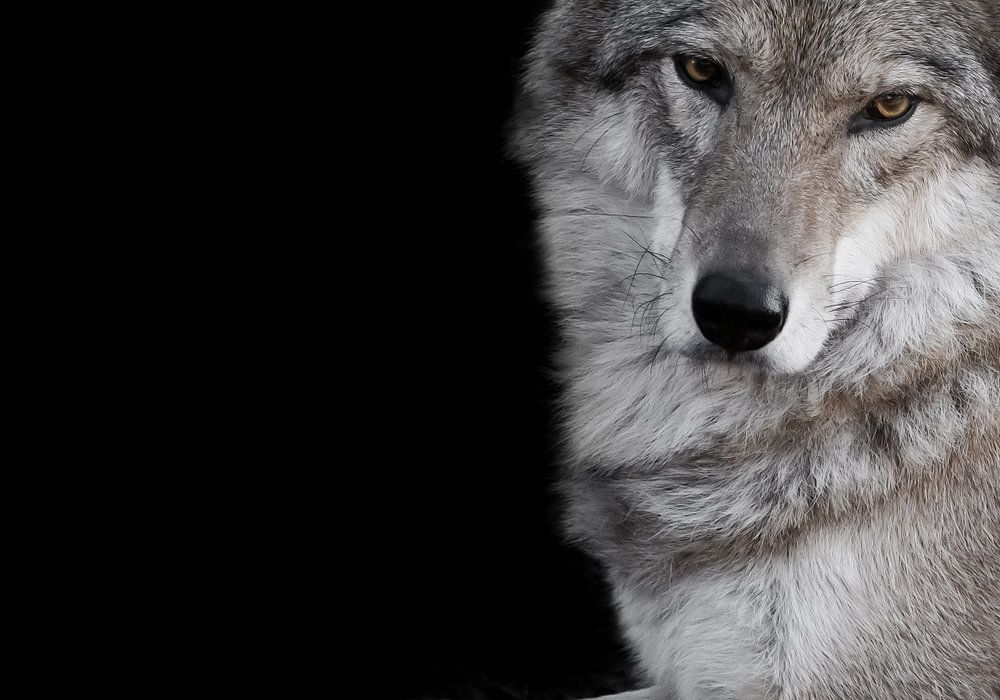 Evaluation du regard. La femelle louve est magnifiquement couchée sur le sol, imposante. Animal gracieux et puissant Fond noir.
