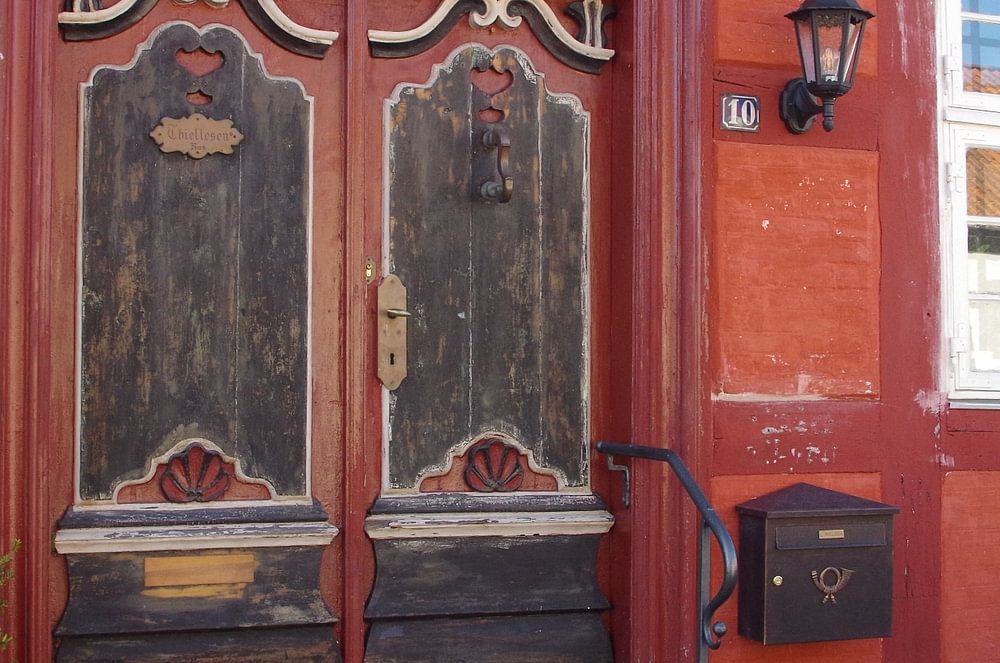 Photo d'une façade et d'une vieille porte dans une rue aléatoire de la ville de Fredericia au Danemark. Des maisons de caractère ornent cette ville vieille de plusieurs siècles, dont la plupart sont encore authentiques. Les vieilles façades colorées respirent l'histoire. Cette maison a de belles vieilles portes ornementales encadrées.