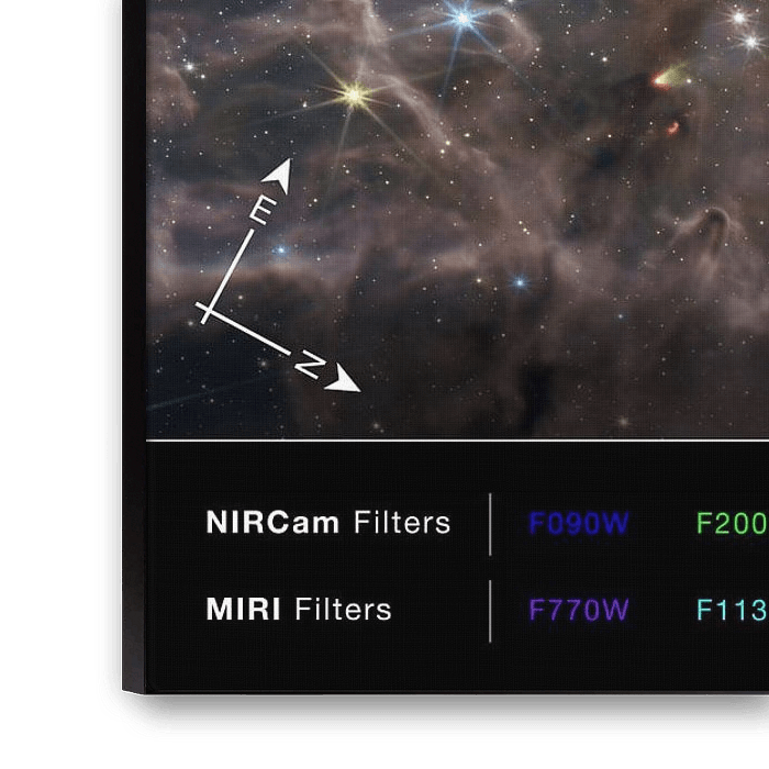 NIRCam - avec sa résolution nette et sa sensibilité inégalée - dévoile des centaines d'étoiles auparavant cachées, et même de nombreuses galaxies de fond. Dans la vue de MIRI, les jeunes étoiles et leurs disques poussiéreux de formation de planètes brillent dans l'infrarouge moyen, apparaissant en rose et en rouge. MIRI révèle les structures enfouies dans la poussière et met en évidence les sources stellaires des jets et des écoulements massifs. Avec MIRI, les hydrocarbures et autres composés chimiques à la surface des crêtes brillent, donnant l'apparence de roches déchiquetées.