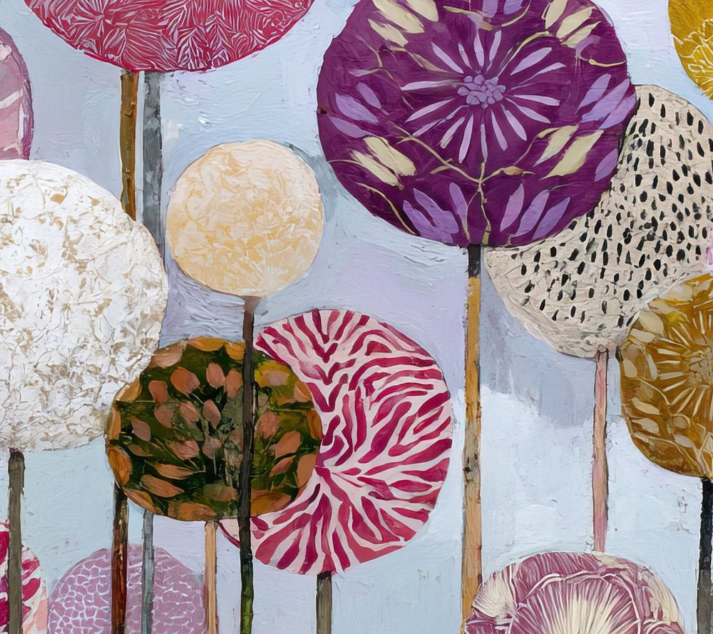 Fantaisie florale ludique - Cette peinture abstraite colorée présente une collection unique de fleurs rondes aux motifs et aux teintes variés, qui créent ensemble une atmosphère joyeuse et ludique dans un ciel bleu tendre.