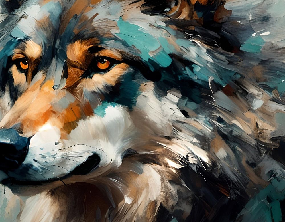 Un loup saisissant regarde vers l'avant avec des yeux intenses, représenté dans un style qui fusionne le réalisme et les coups de pinceau abstraits. L'arrière-plan suggère un paysage brumeux et boisé qui complète l'essence sauvage de l'animal.