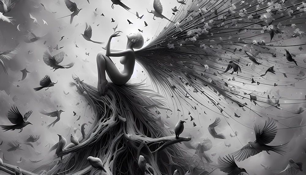 Cette œuvre d'art impressionnante représente une fée mystique à l'esthétique noire et blanche, qui symbolise l'équilibre entre la vie et la mort. La fée est liée à la nature et incarne aussi bien la force de la vie que l'éphémère. L'interaction entre l'ombre et la lumière est représentée de manière artistique avec des lignes nettes et des contrastes forts, ce qui confère à l'image une atmosphère profonde et contemplative.