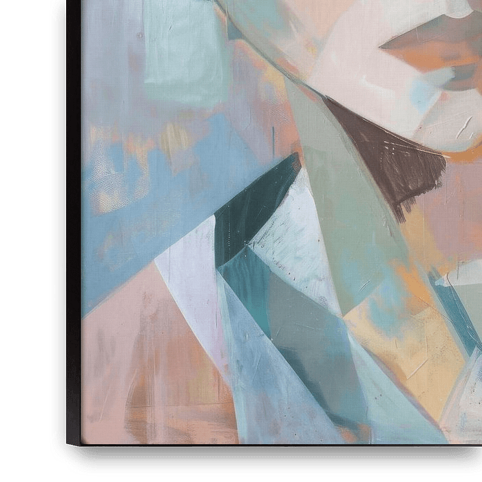 Ce portrait de femme époustouflant de style cubiste associe des tons pastel de bleu, de beige et de rose en une composition harmonieuse. Le visage, abstrait dans des surfaces géométriques, dégage un calme et une grâce fascinants. Les lignes modernes et épurées et la palette de couleurs douces font de cette œuvre d'art un accroche-regard…