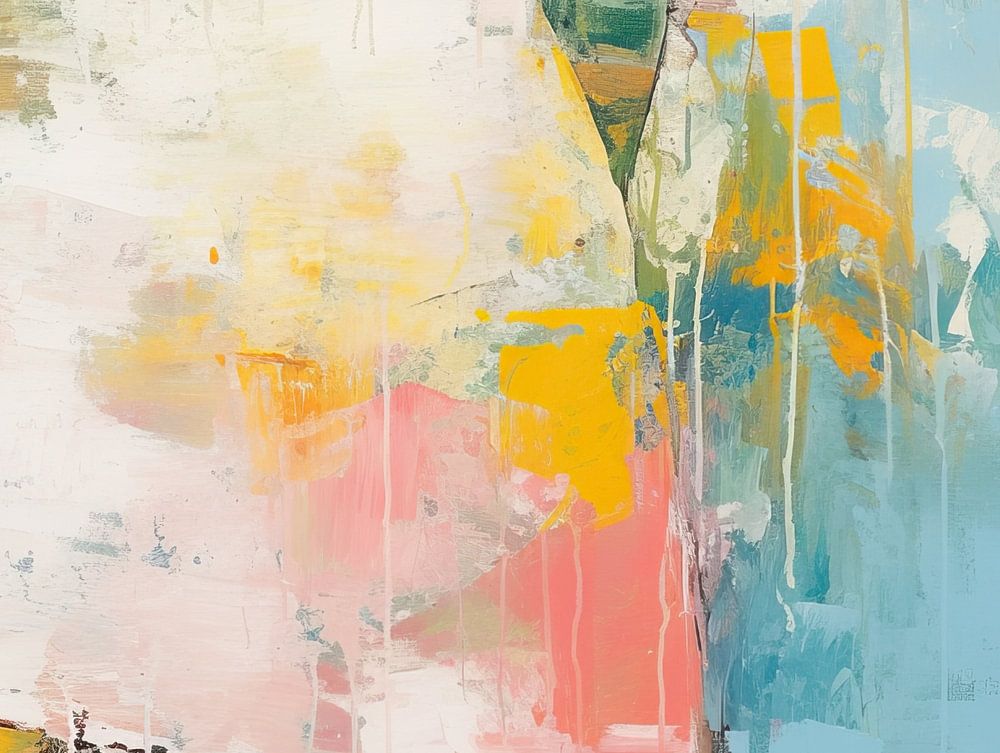 Femme abstraite - Cette peinture abstraite représente une femme aux jambes jaunes entourée de couleurs douces telles que le vert, le rose et le jaune qui donnent un aspect joyeux et moderne.