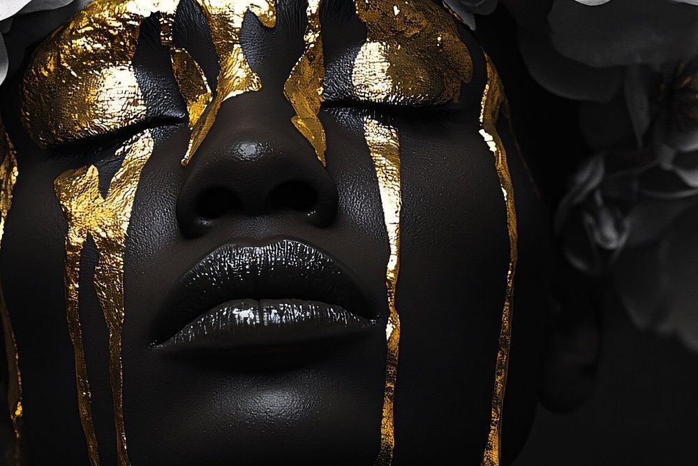 Ce motif représente le portrait intrigant d'une femme au teint foncé et profond, dont le visage est recouvert d'une peinture dorée qui dégouline de façon spectaculaire. Elle porte sur la tête une couronne de fleurs blanches délicates, qui contraste magnifiquement avec sa peau foncée et les accents dorés. Cette image est un mélange parfait de modernité et d'élégance, la palette de couleurs monochromes étant ponctuée par l'éclat chaud de l'or. Le motif dégage un sentiment de force et de sérénité, et constituerait un ajout impressionnant à n'importe quel espace, en particulier en tant que pièce d'apparat dans un décor moderne ou minimaliste.