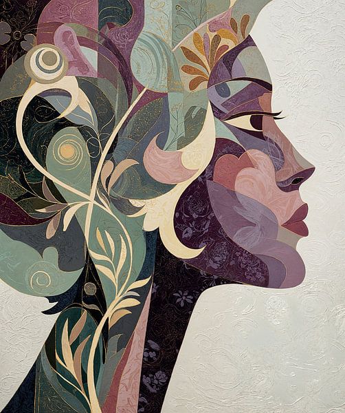 Femme avec fleurs | Femme élégante avec fleurs - Ce tableau représente une femme à la silhouette élégante entourée de formes fluides et de détails floraux dans des couleurs douces et mélangées telles que le violet, le vert et le crème.