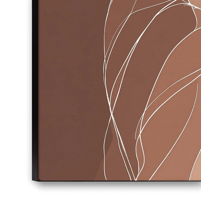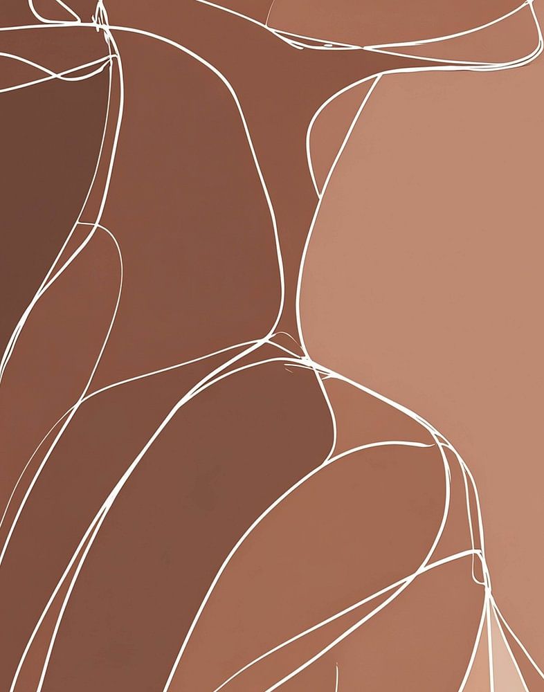 Silhouette stylisée d'une femme vue de profil, composée de fines lignes blanches flottant gracieusement sur un fond chaud et monochrome dans les tons beige et marron. Les lignes suivent les contours du corps et du visage d'une manière presque calligraphique, créant un sentiment de sophistication, de tranquillité et de force intérieure.